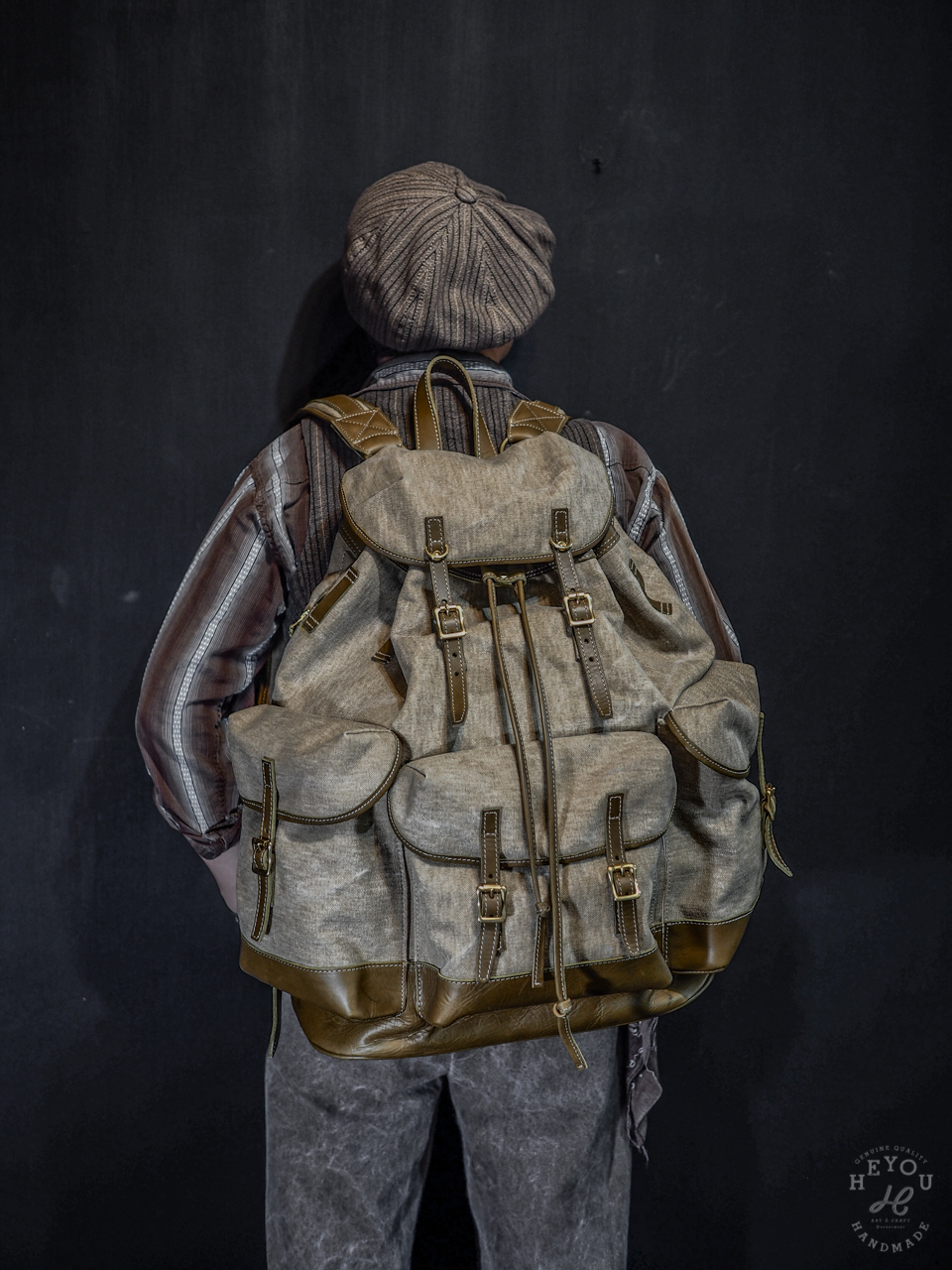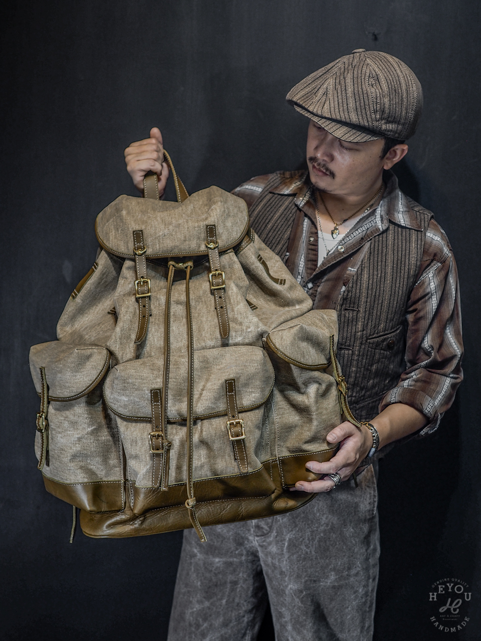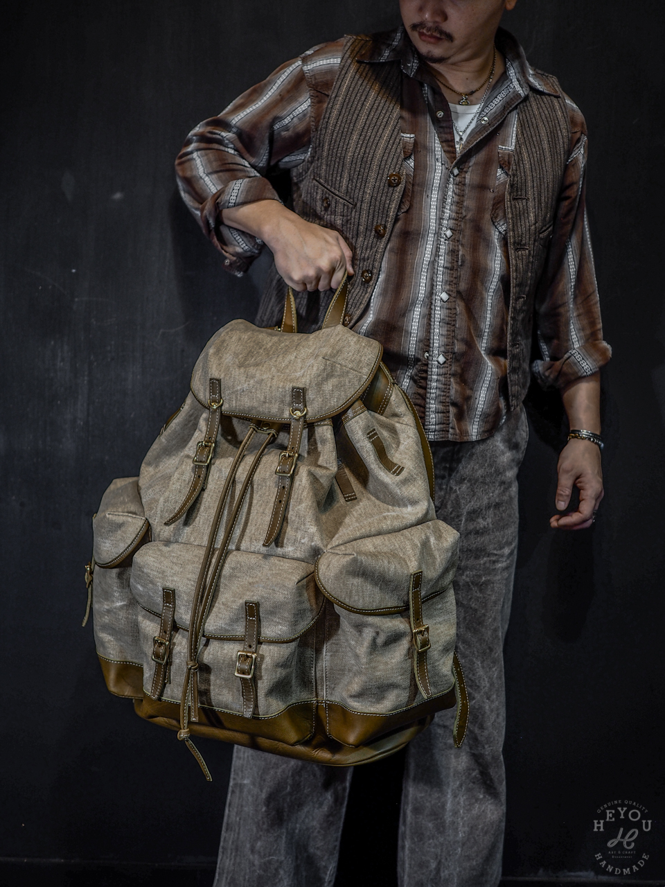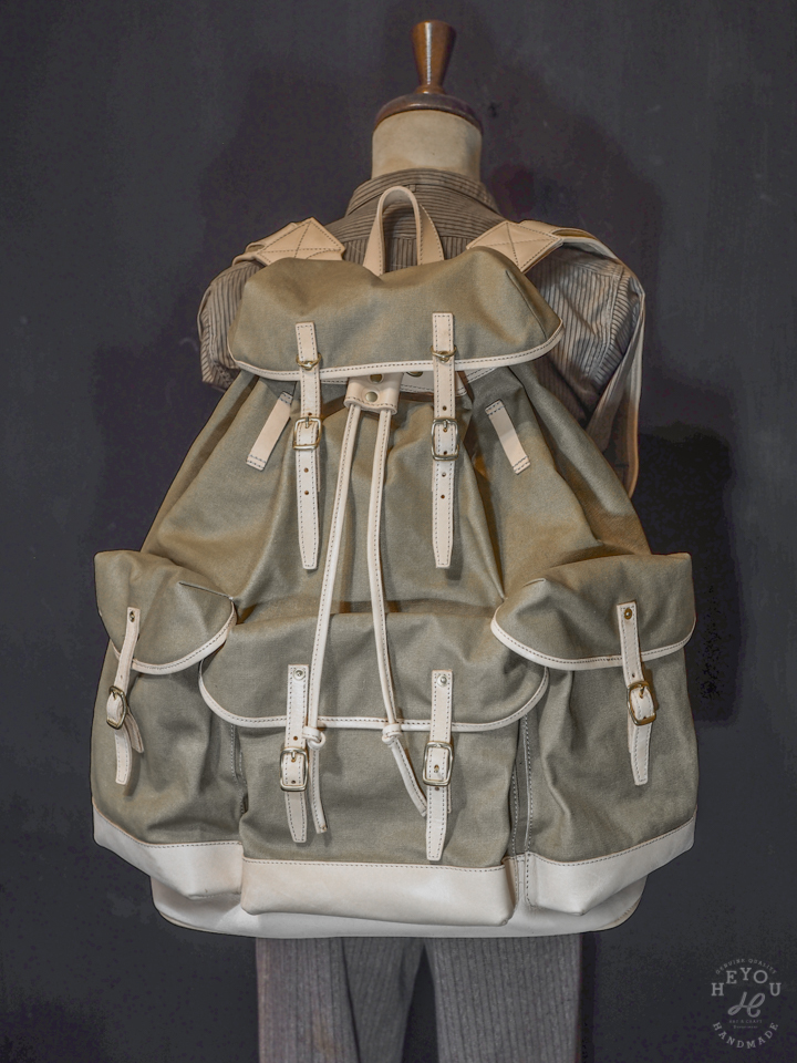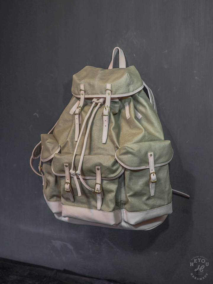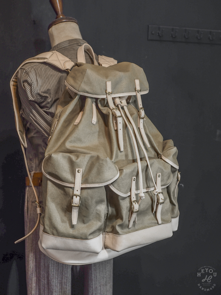 材料選用水洗厚帆布 + 植鞣牛皮以合襯古早的軍包質感。