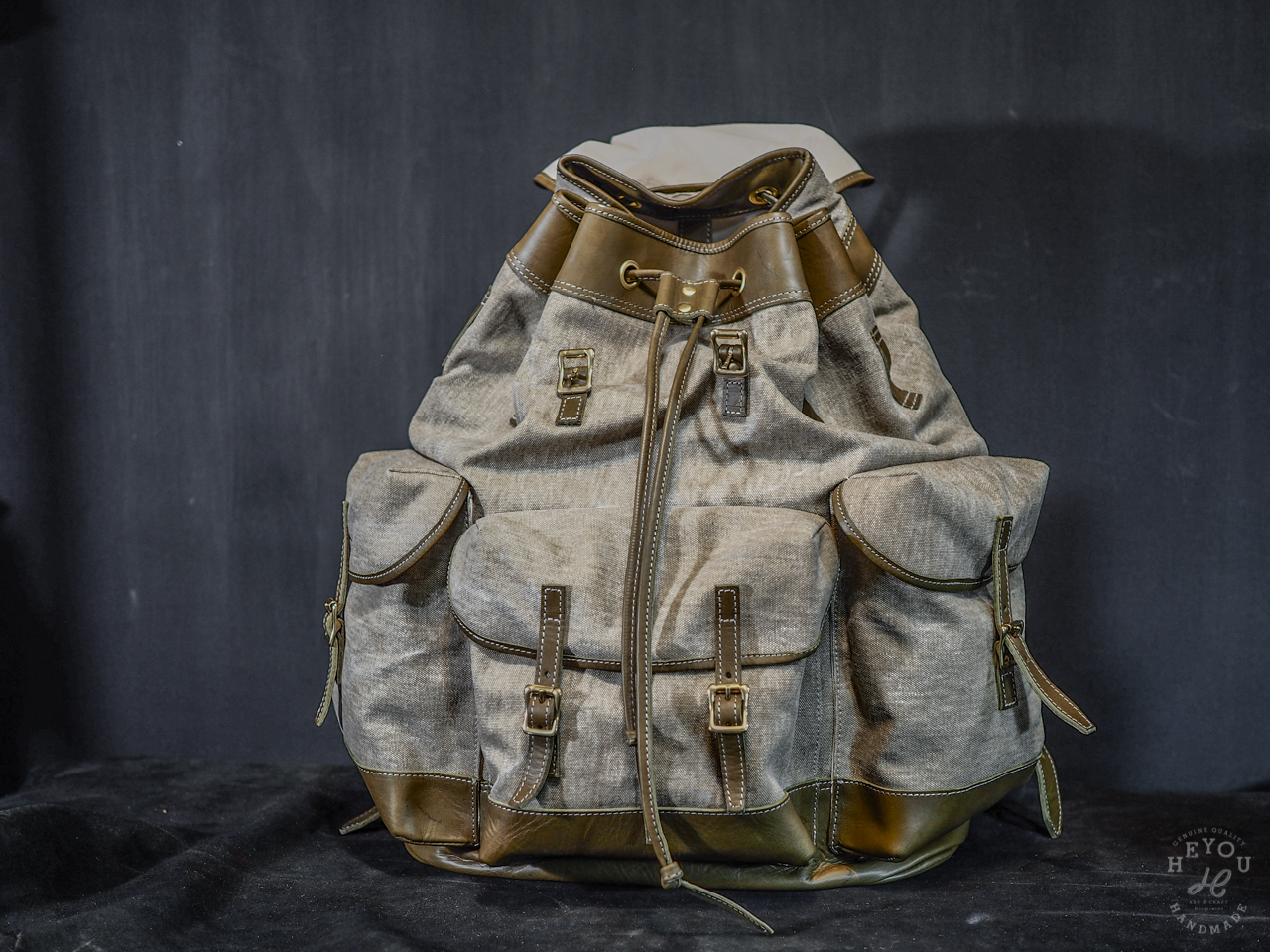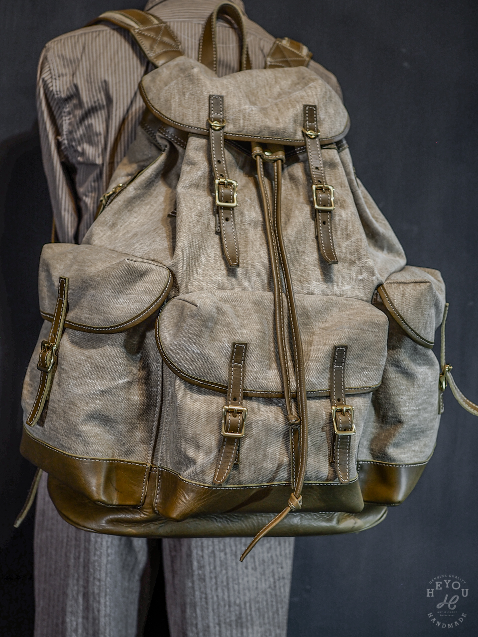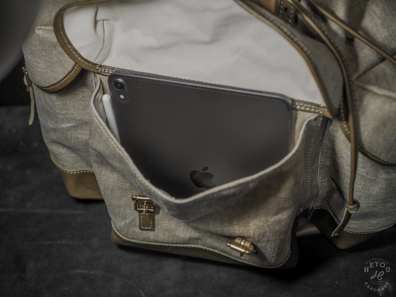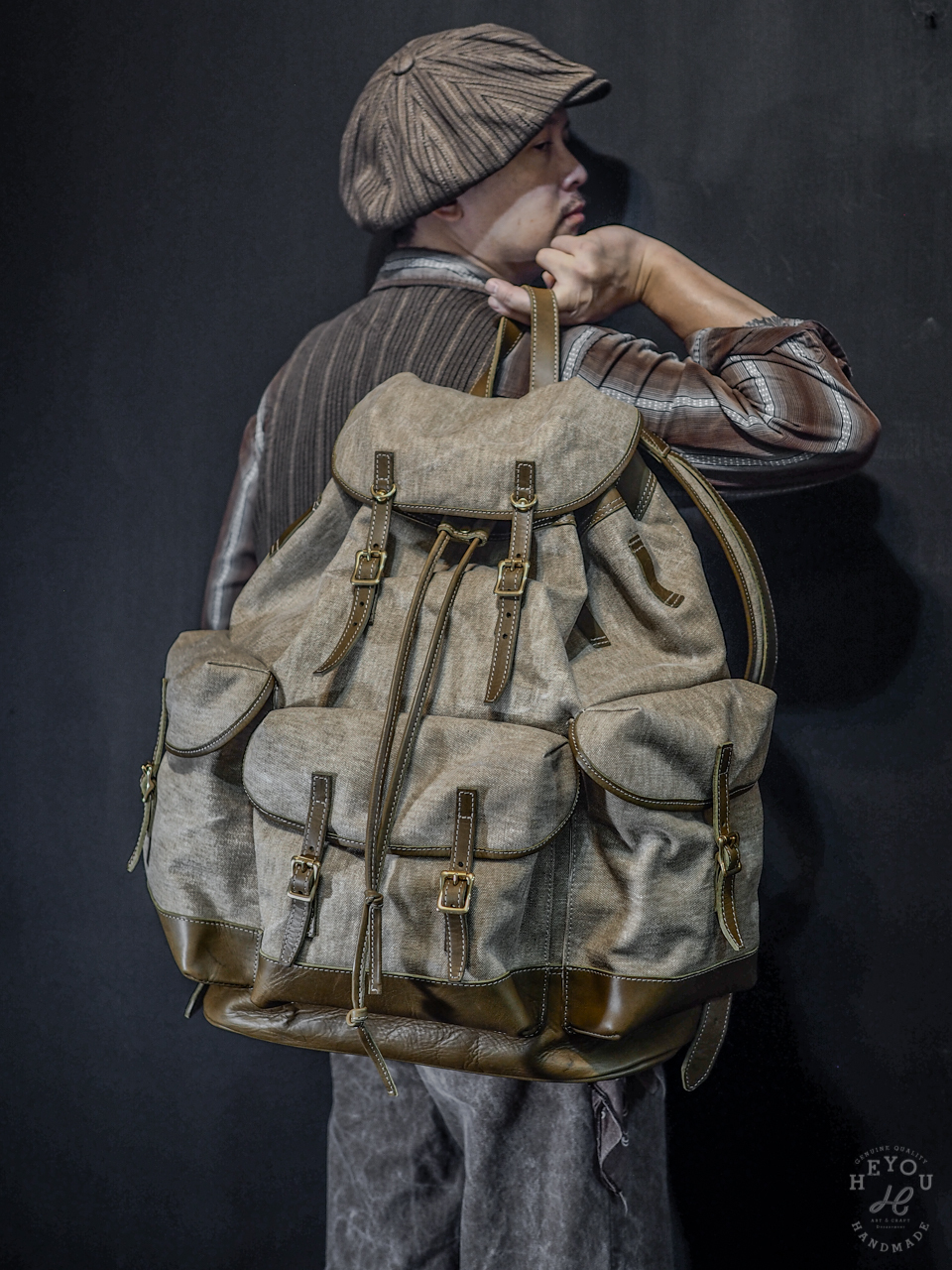材料選用水洗厚帆布 + 植鞣牛皮以合襯古早的軍包質感。